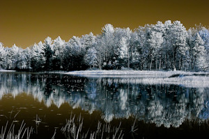 The birch trees stood out more than anything else in the landscape. Even with the bright white of the frozen lake, these trees appeared to rise from the ground like white veins popping from the shoreline against the darker trees. Although the light was even and flat, the contrast was most striking.